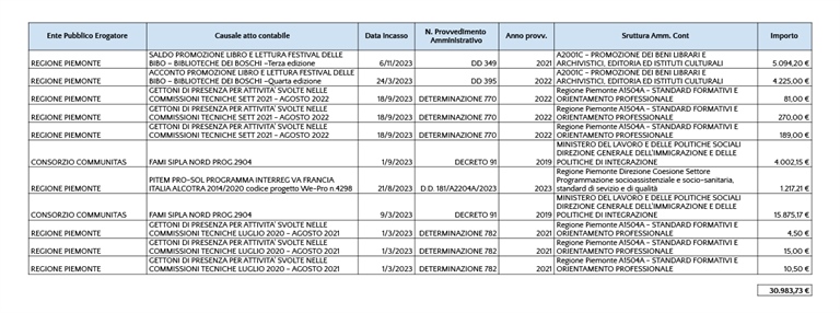 Ai sensi della Legge n. 124 del 4/8/2017 “Legge annuale per il mercato e la concorrenza”, e smi ( Decreto legge 30 aprile 2019 n. 34, art. 35) si precisa che nel corso del 2021 sono stati incassati contributi dalla Regione Piemonte pari a un complessivo di Euro 12.270,00