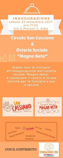 "Da tempo avevamo in mente di realizzare un percorso di inclusione sociale che ben si coniugasse con la vocazione principe del territorio albese, l’enogastronomia – commenta Gian Piero Porcheddu, direttore del Consorzio Sinergie Sociali. L’opportunità ci è stata offerta dalla Parrocchia di San Cassiano, che ci ha messo a disposizione una struttura splendida, capace di ospitare attività sportive, un bar, spazi di incontro per iniziative culturali e, naturalmente, l’Osteria Sociale. Nel progetto ha creduto fortemente la Fondazione Cassa di Risparmio di Cuneo. Con il suo fondamentale apporto e grazie all’enorme lavoro della nostra cooperativa sociale Astrolavoro già da questa estate abbiamo potuto aprire al pubblico una parte del Circolo. Sabato 23 sarà la volta dell’osteria Magna Neta, ovvero Zia Neta. Un nome affettuoso, tradizionale delle Langhe, attraverso il quale abbiamo voluto esprimere il nostro legame con il territorio, con la cucina buona e semplice, in un clima accogliente e familiare. Magna Neta è la parte che ancora mancava al Circolo San Cassiano per diventare un luogo di aggregazione, di inclusione, di divertimento e di crescita, presso il quale, a regime, lavoreranno oltre 20 persone, di cui la metà saranno ragazzi svantaggiati.”